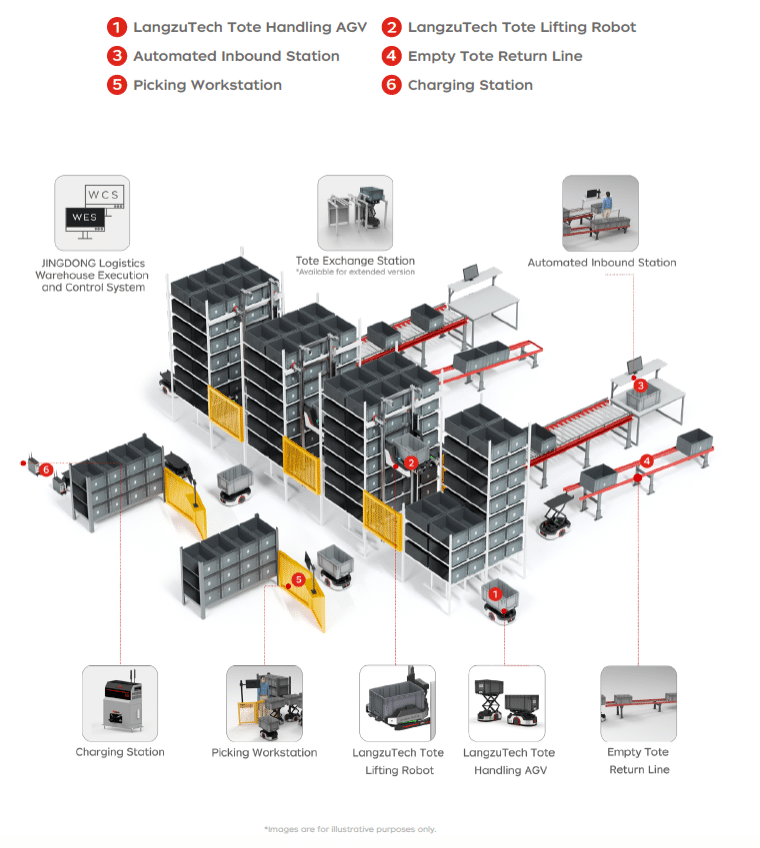 To address these challenges, JINGDONG Logistics has developed the LangzuTech Tote Handling, a Goods-to-Person (G2P) system.