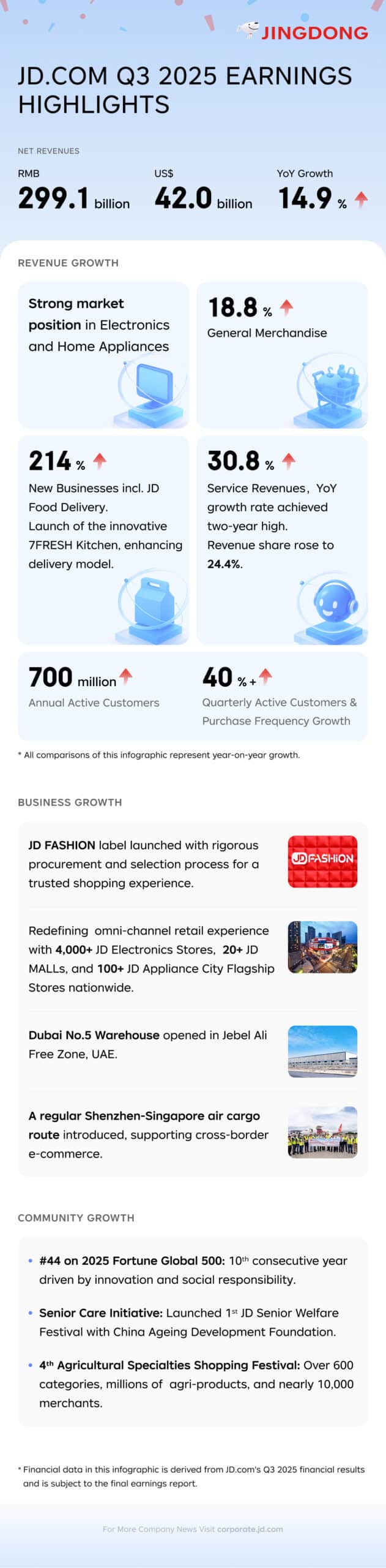 On November 13, 2025, JD.com released its Q3 2025 financial results, demonstrating a strong performance and healthy progress across our diverse business lines. Our cutting-edge supply chain capabilities continue to drive exceptional customer experiences and pioneering industry innovation, marked by a remarkable milestone: surpassing 700 million annual active customers by October.